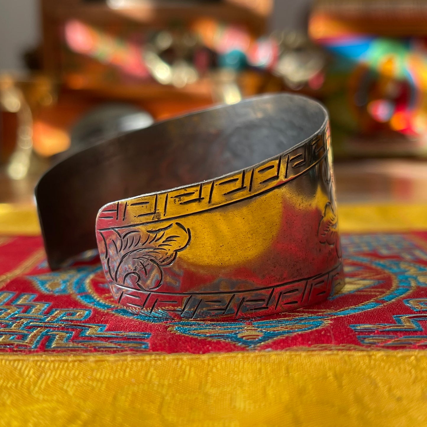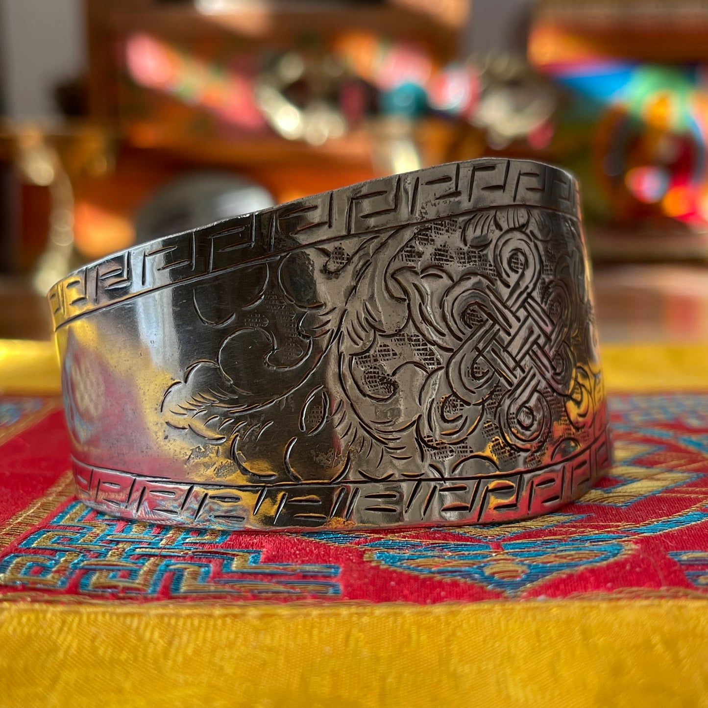 Discover the timeless elegance of our White Metal Cuff Bracelet, intricately hand-etched in Nepal with a variety of sacred Buddhist symbols. These chunky yet graceful bracelets are more than just accessories—they’re meaningful pieces that add a touch of spirituality and style to any outfit.