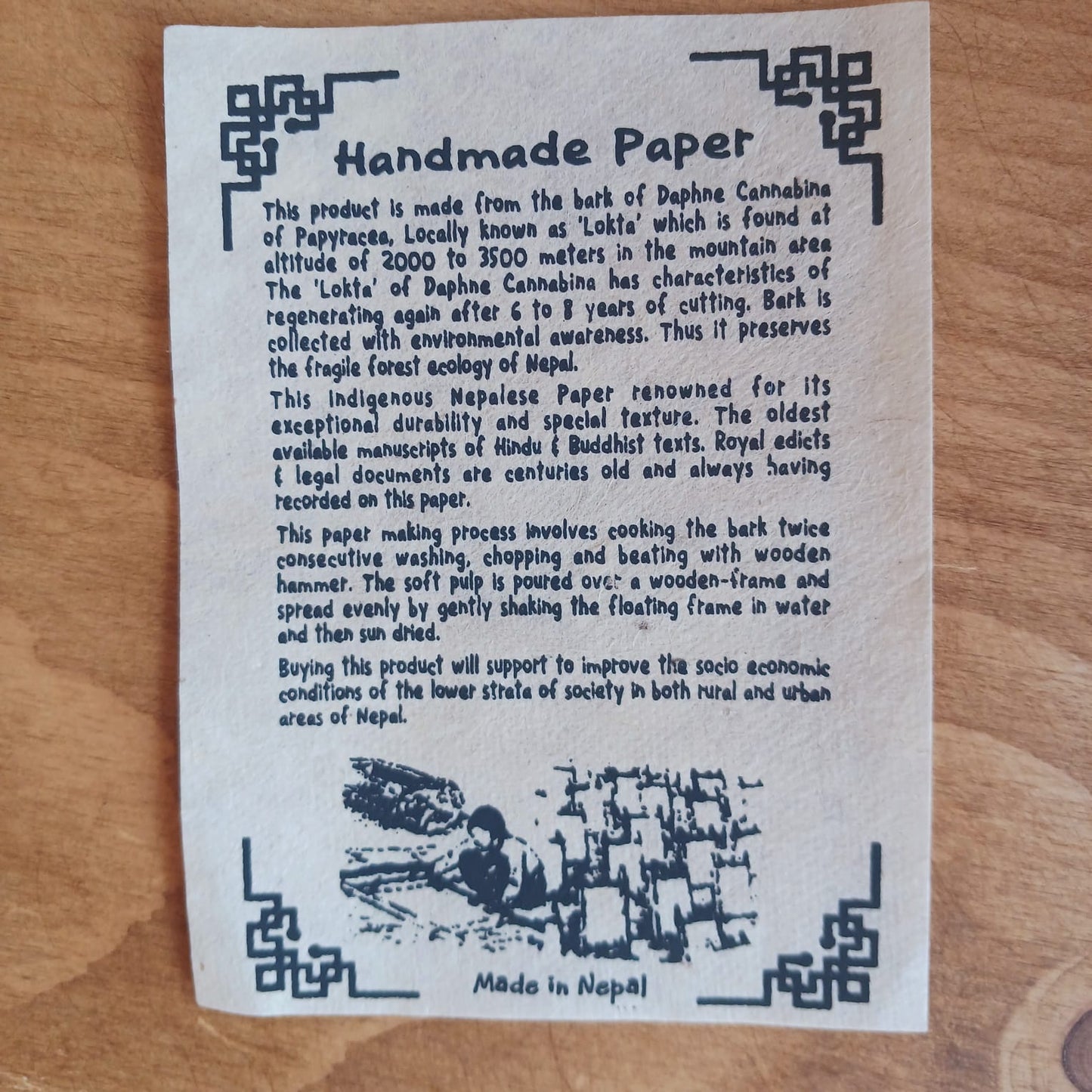 Lokta paper is made from the bark of the bush named Daphne Papyrus, which only grows at an altitude of 6500ft or above in the Himalayas. The inner bark is stripped away, but the root system isn't damaged and regrows ~ making this a fully sustainable resource