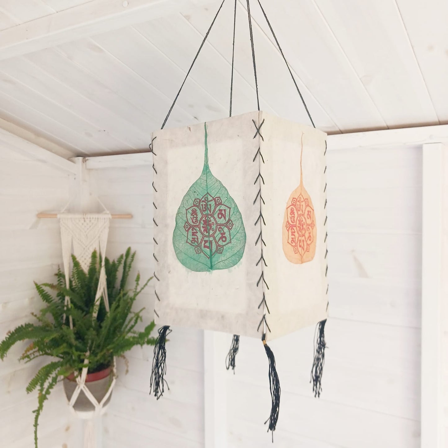 Hand Made In Nepal these natural Lokta Paper lampshades have been carefully handmade and block printed. The four sides are sewn together with black thread. Each side has Tibetan Om symbols printed on coloured Bodhi leaves.