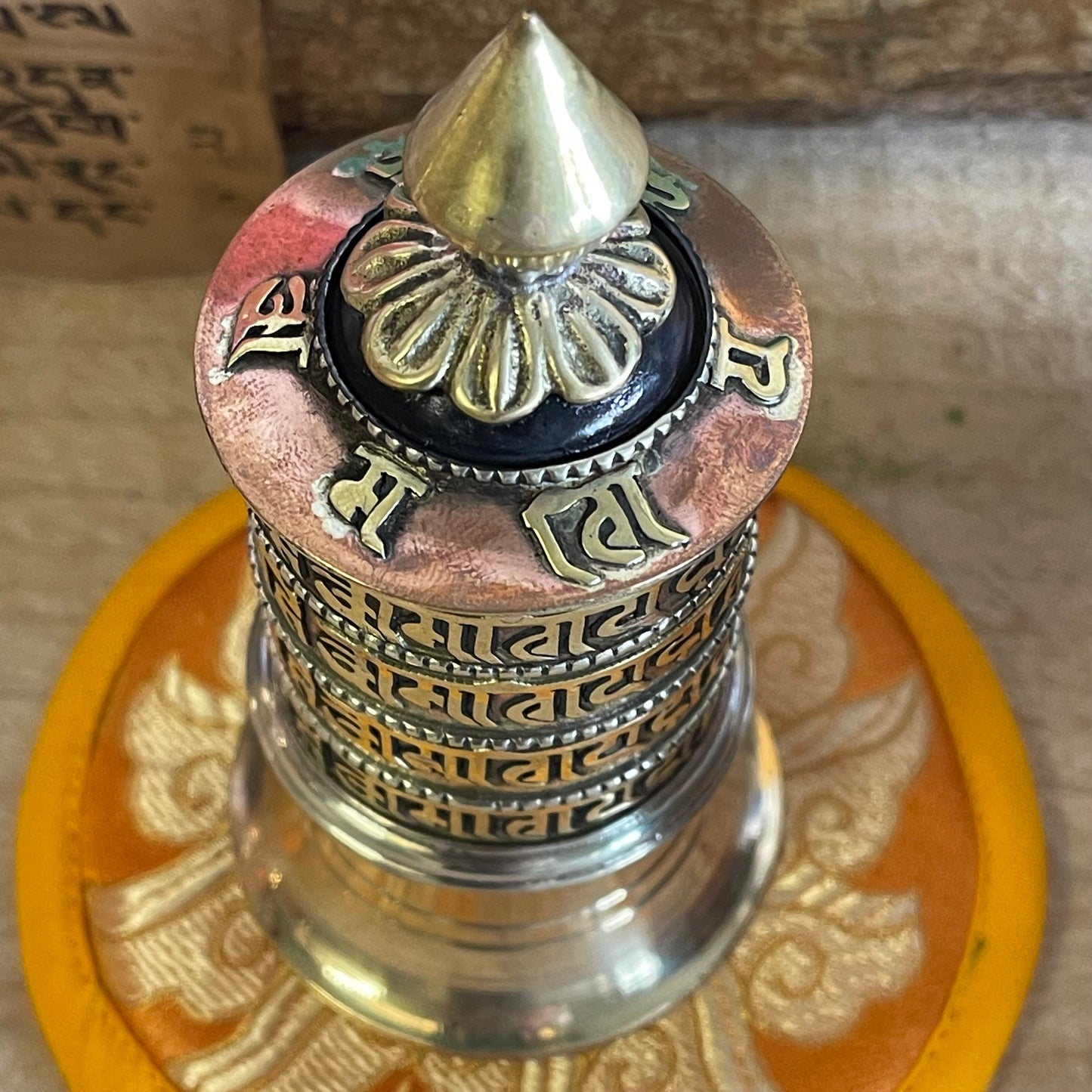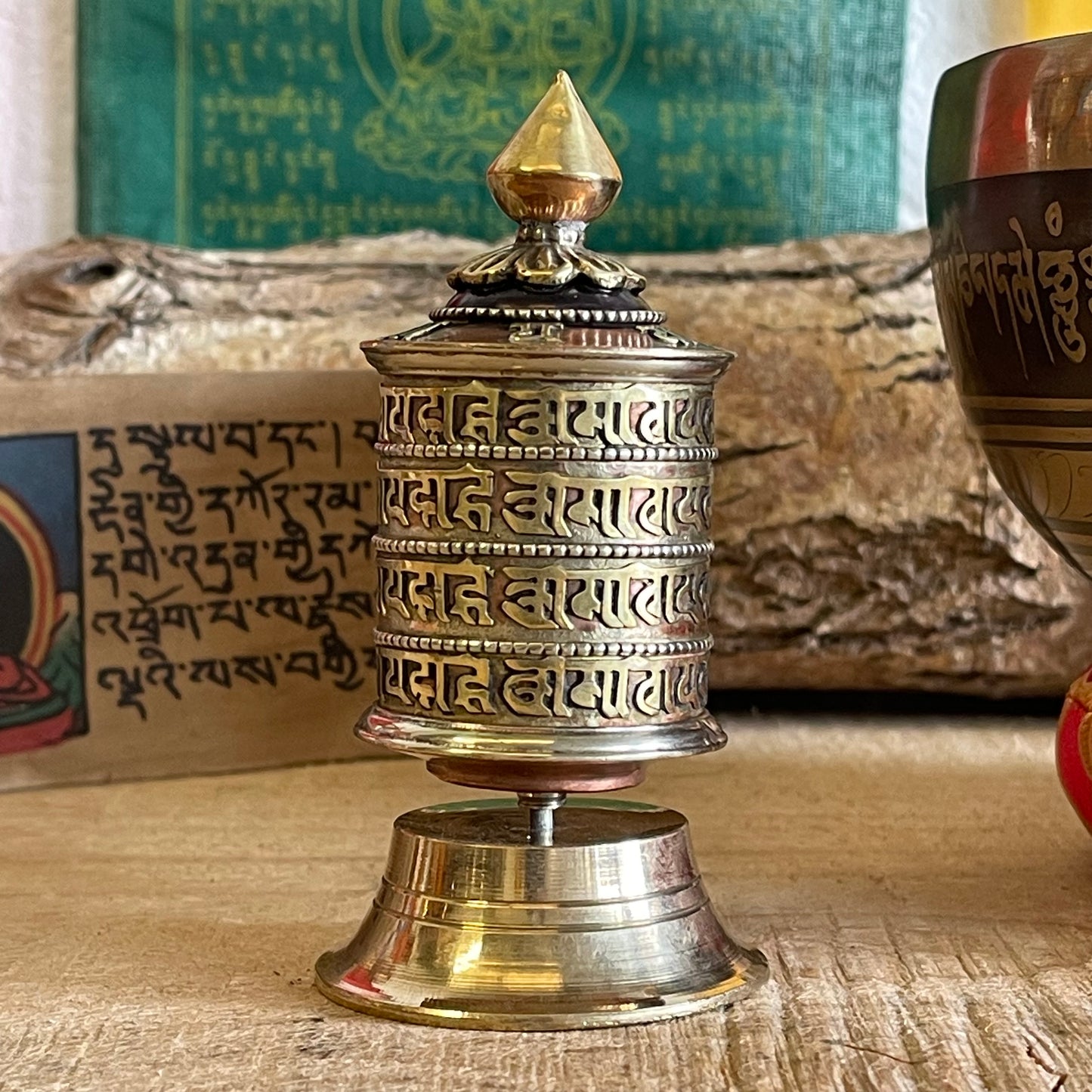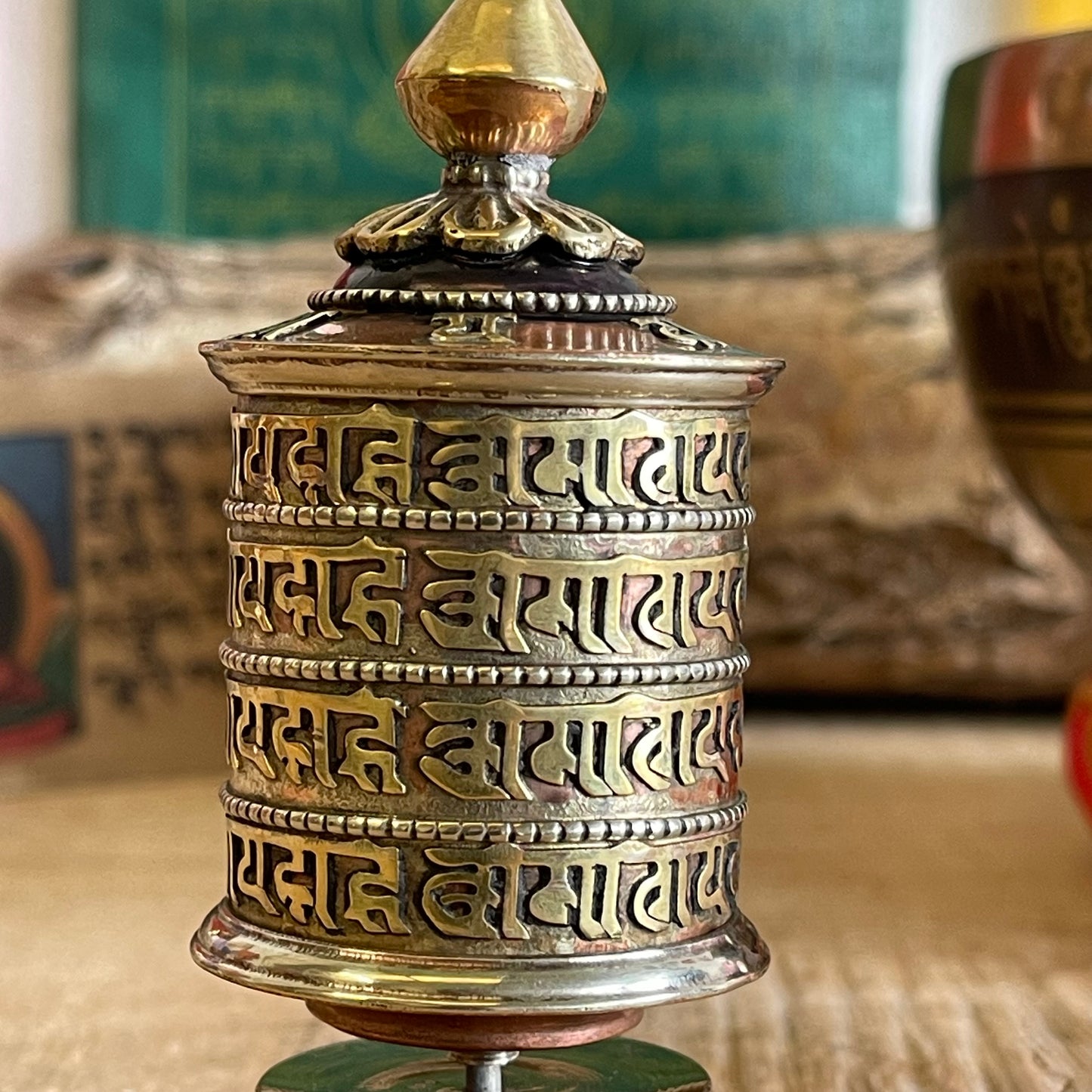 Crafted from a mix of copper and solid brass, the wheel features four lines of sacred mantra around its exterior and rests on a finely detailed brass base. According to Tibetan Buddhist tradition, spinning the prayer wheel is equal in merit to reciting the mantra aloud, purifying negativity and generating compassion.