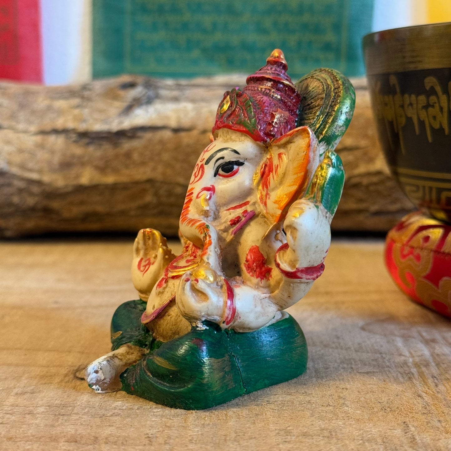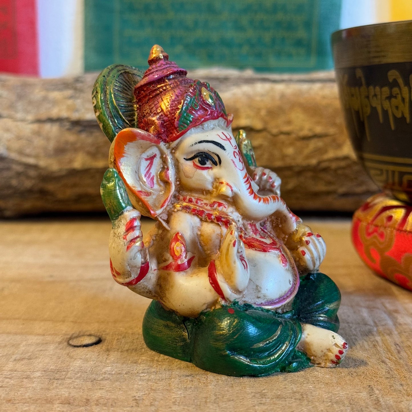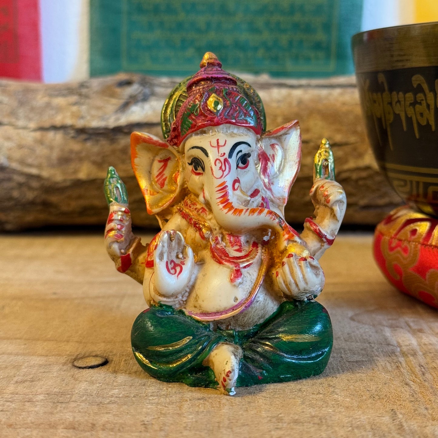Hand-painted 9 cm resin Ganesh statue, the elephant-headed deity known as remover of obstacles, patron of wisdom, arts, and sciences. Depicts symbolic elements: axe, rope, bowl of sweetmeats, blessing mudra, and his mouse vahana, representing mindfulness and control over desire. Perfect for altars, meditation corners, or as a spiritual décor accent