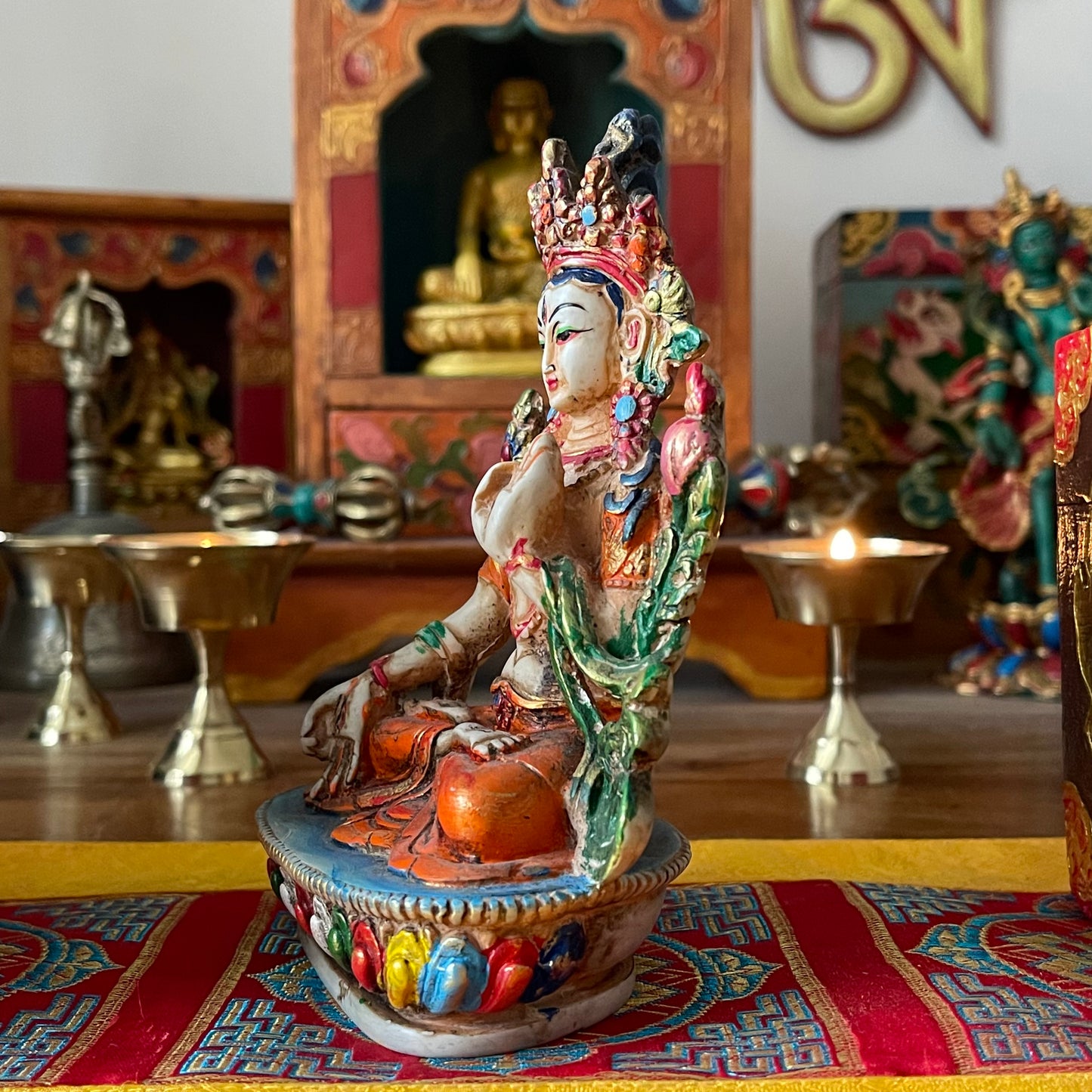Each piece is intricately made from high-quality resin by skilled Nepalese artisans, capturing the sacred essence of White Tara in stunning detail. This statue is perfect for your meditation space, altar, or as a thoughtful spiritual gift.