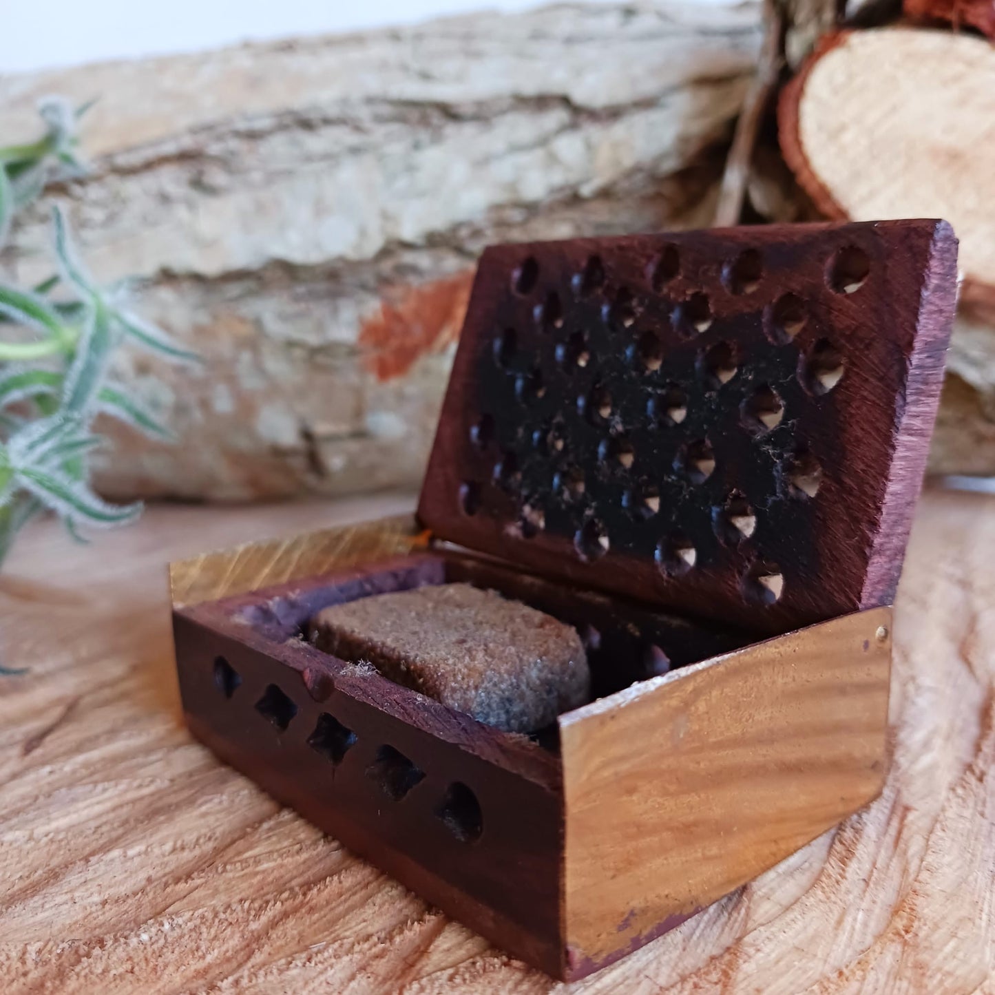 It can also can be taken out of the box and crushed for a light fragrance, or burned on charcoal for a strong burst.