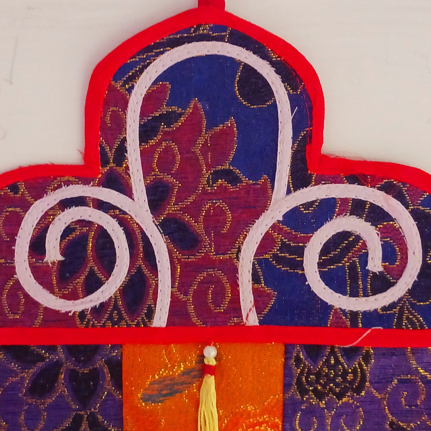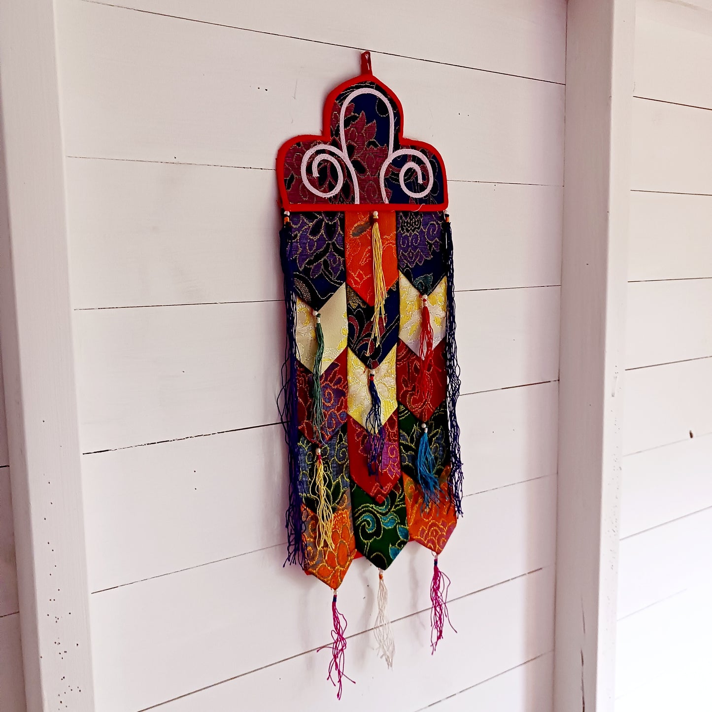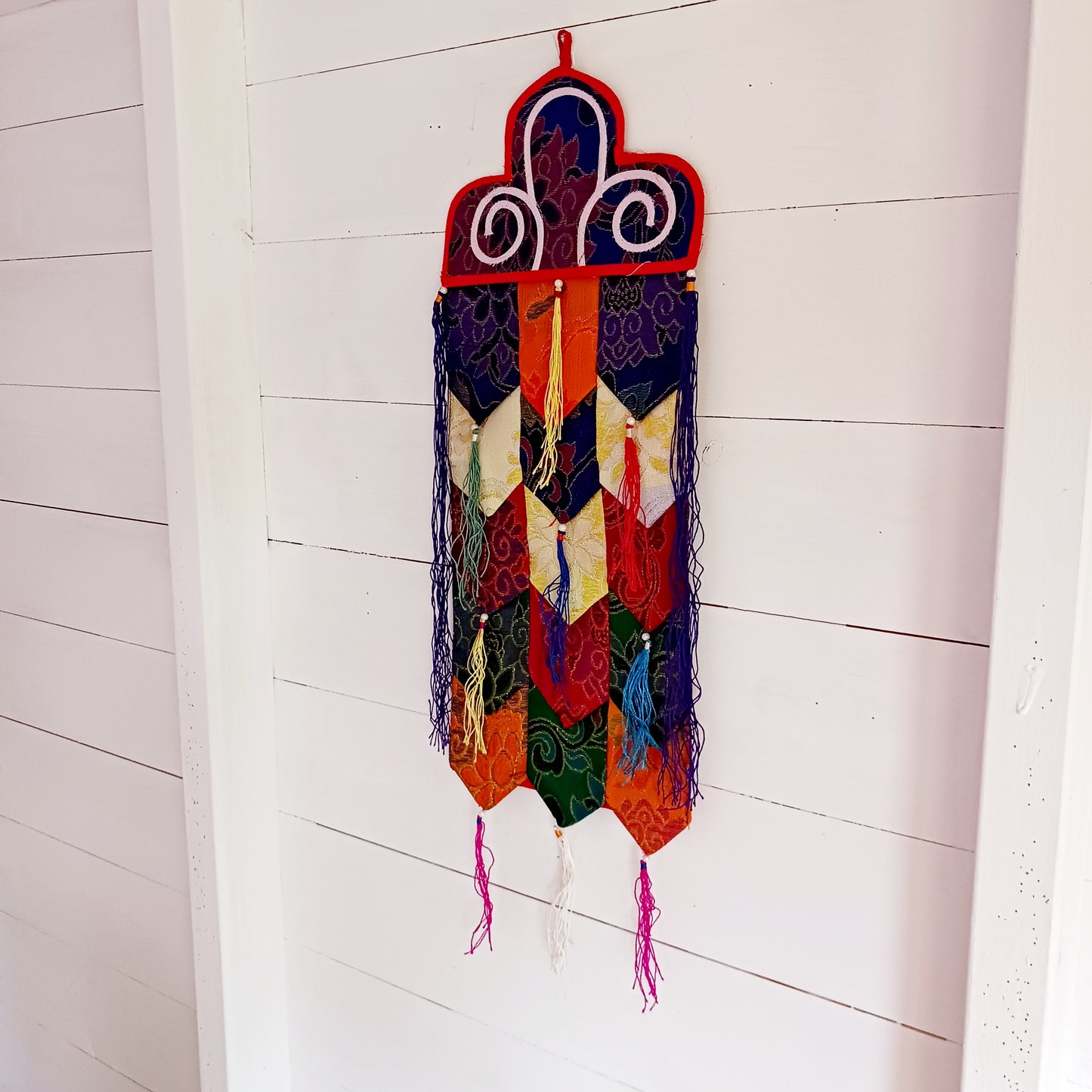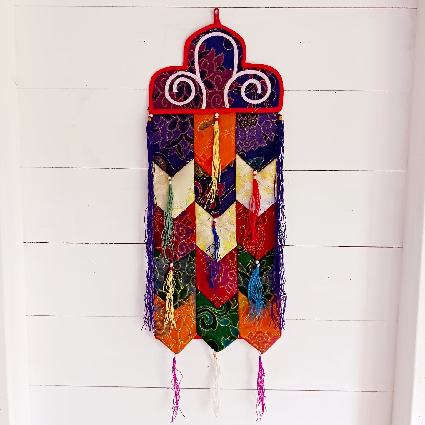 This Tibetan brocade Kaden Banner symbolizes the interlocking of the different Elements and directions. It's tubular shape with brightly colored fabric and tassels is perfect for decorating your home or shrine area.