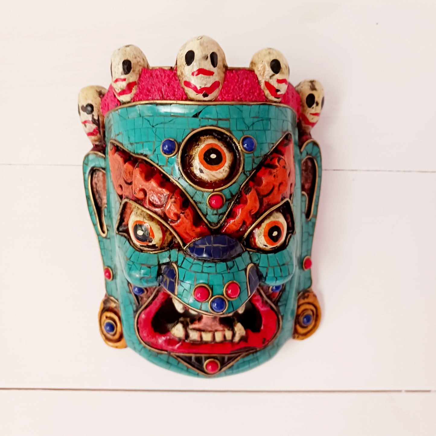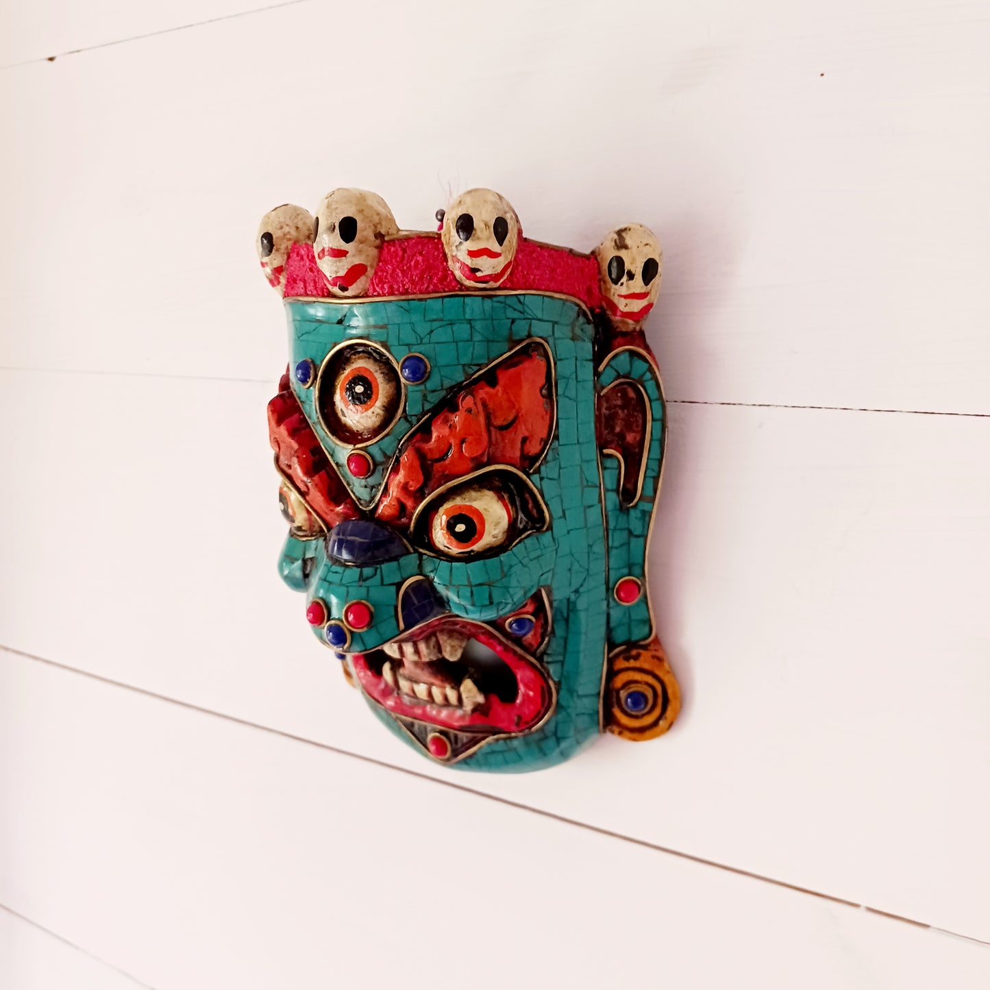 This Mahakala mask is a beautifully handcrafted wooden piece featuring intricate details and a unique design. This particular mask is studded with Turquoise, Corals and Lapis that enhances it’s beauty and value. Brass & White metal is also used to enhance the character.