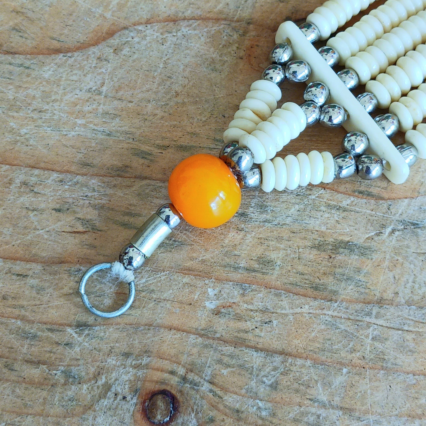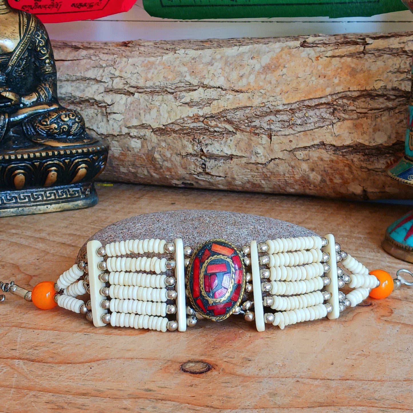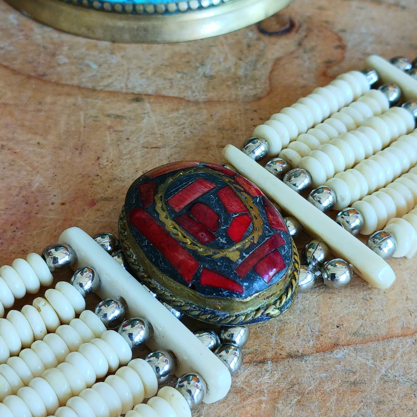 These beautiful bracelets have six rows of hand-threaded tiny cream discs, the centre piece is made from brass, inlaid with coral chips. There is a simple clasp to close.