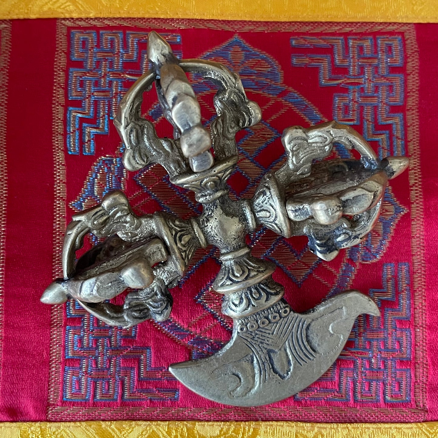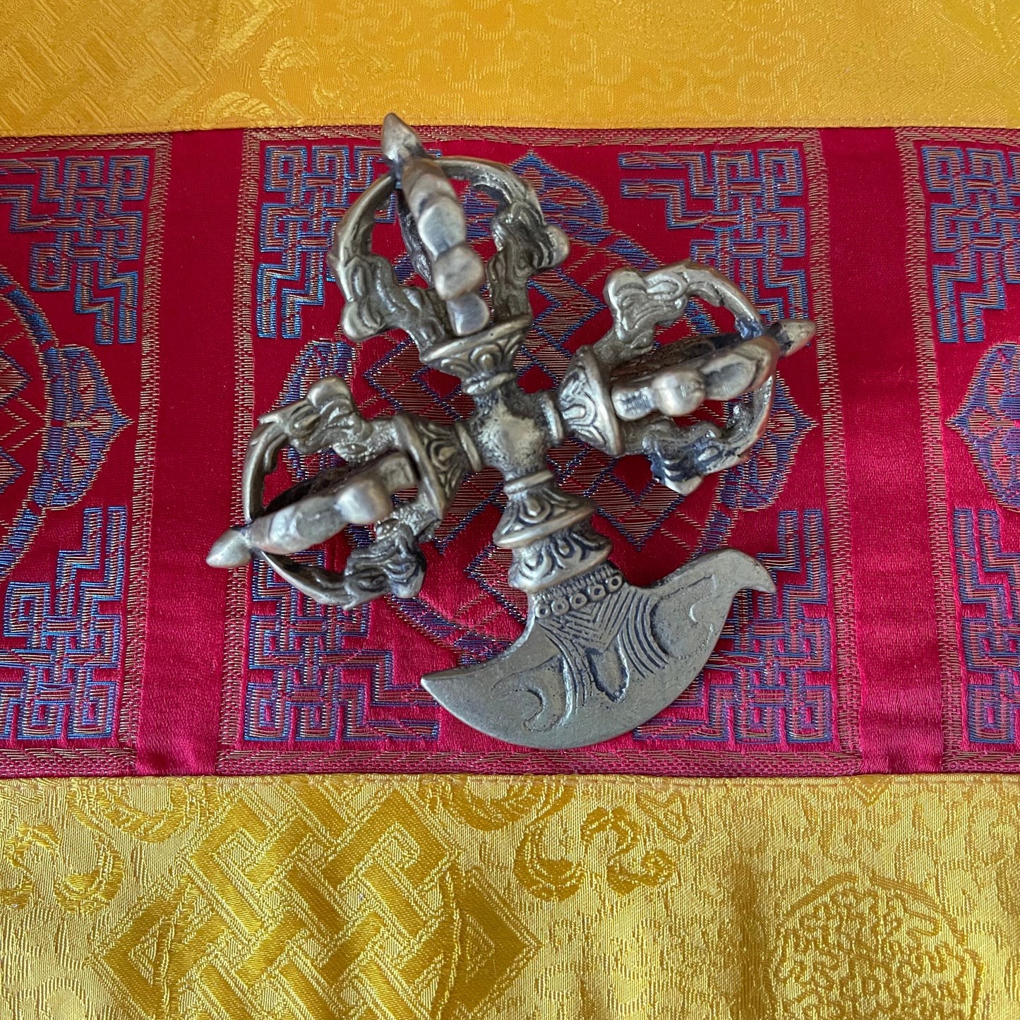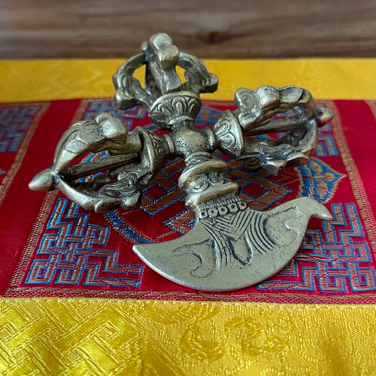 The Kartika, also known as the "Ritual Crescent Knife," is a sacred Buddhist implement symbolizing the severance of all material and worldly attachments. Deeply rooted in Tibetan Buddhism, the Kartika is closely associated with Mahakala, the wrathful protector of the Dharma, and Dakinis, celestial beings who aid in the spiritual journey. It is also revered in connection with powerful Dharmapalas like Yama and Yamantaka, embodying protection and transformation.