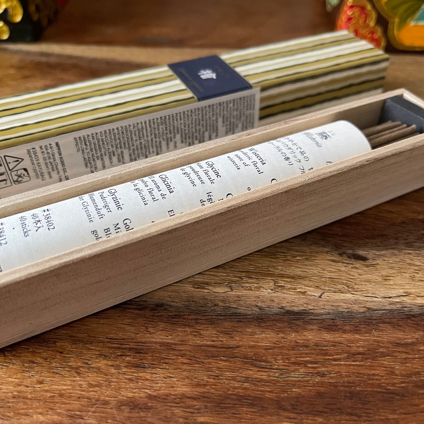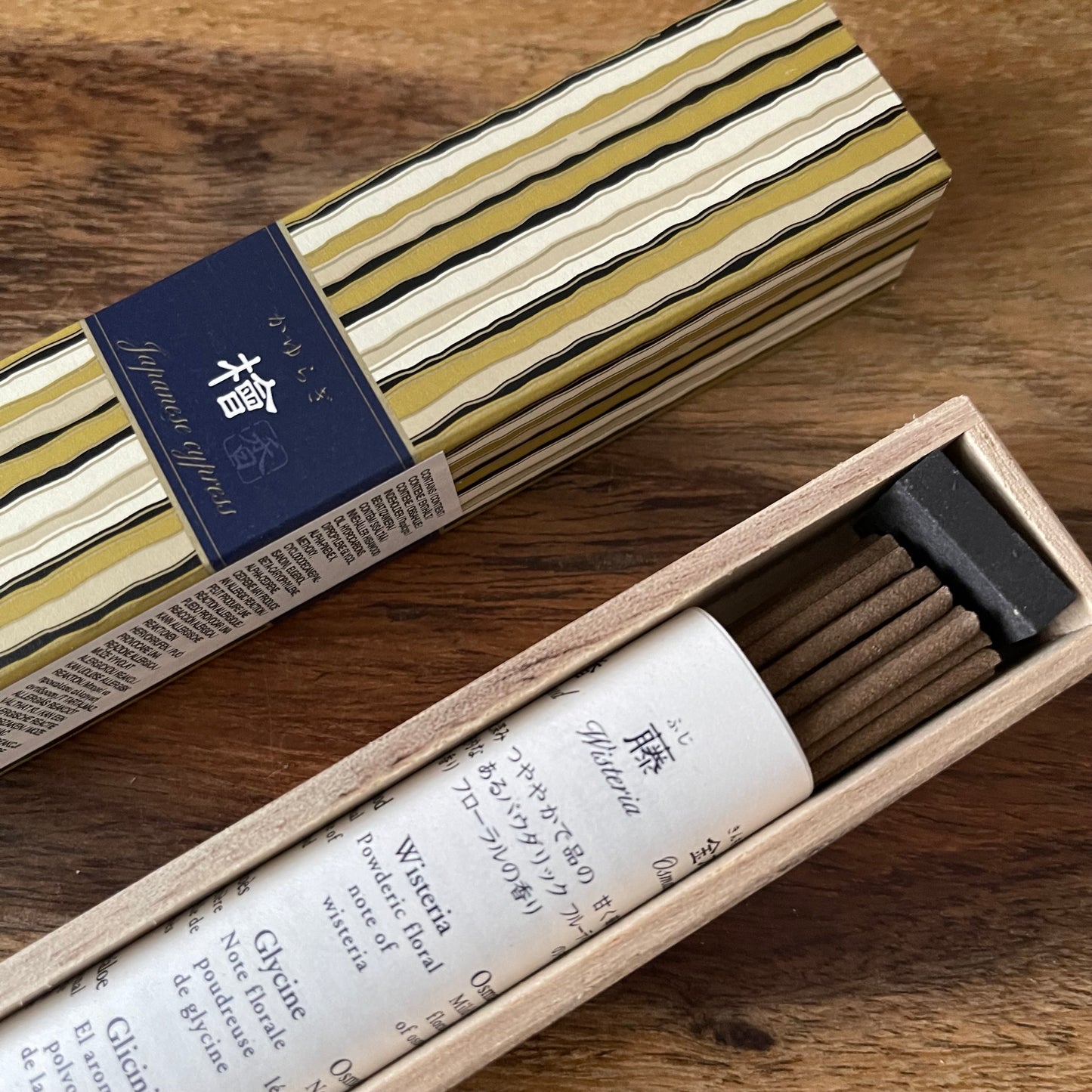The Kayuragi Japanese Cypress incense sticks come presented in a Paulownia wood box with an attractively designed stripe design on the lid – inspired by the colors of Japanese kimono fabric. The incense sticks are an olive green/brown colour, reflective of the natural environment of the cypress trees, and come supplied with an incense stick holder.