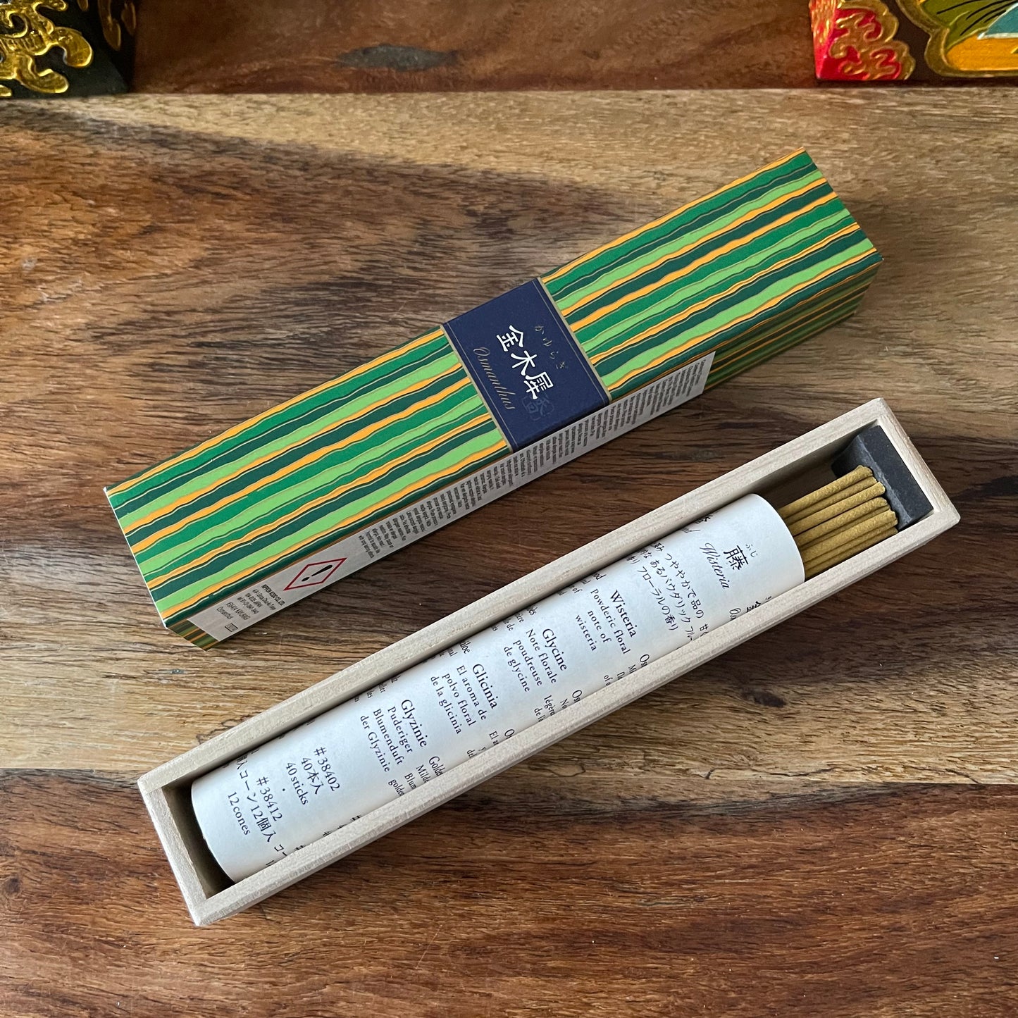 Osmanthus is a type of flowering plant that’s native to Asia and the incense has a mild, fruity and floral aroma. The box of 40 incense sticks comes attractively presented in a green, yellow and blue striped Paulownia wood box, complete with a small incense stick holder. The box design is inspired by the colours of traditional Japanese kimono fabric and provides a striking and colorful display.