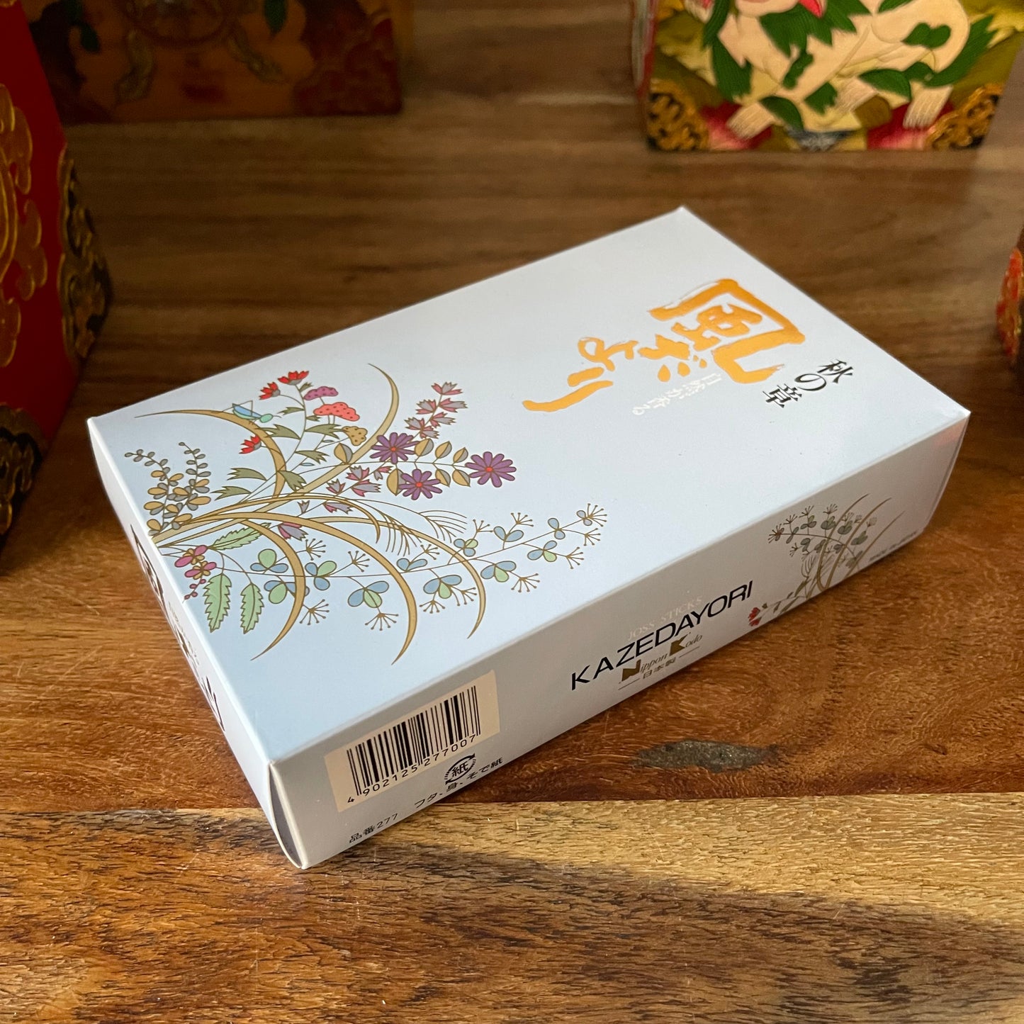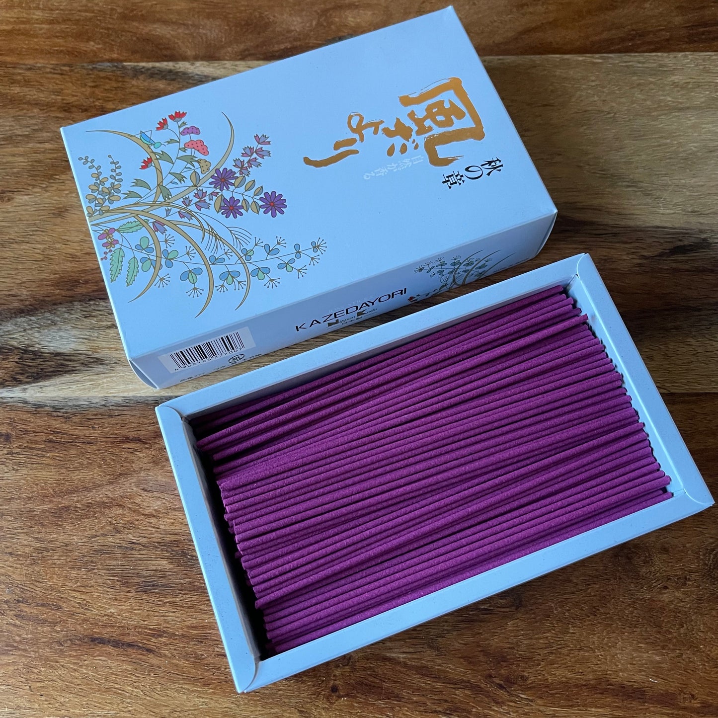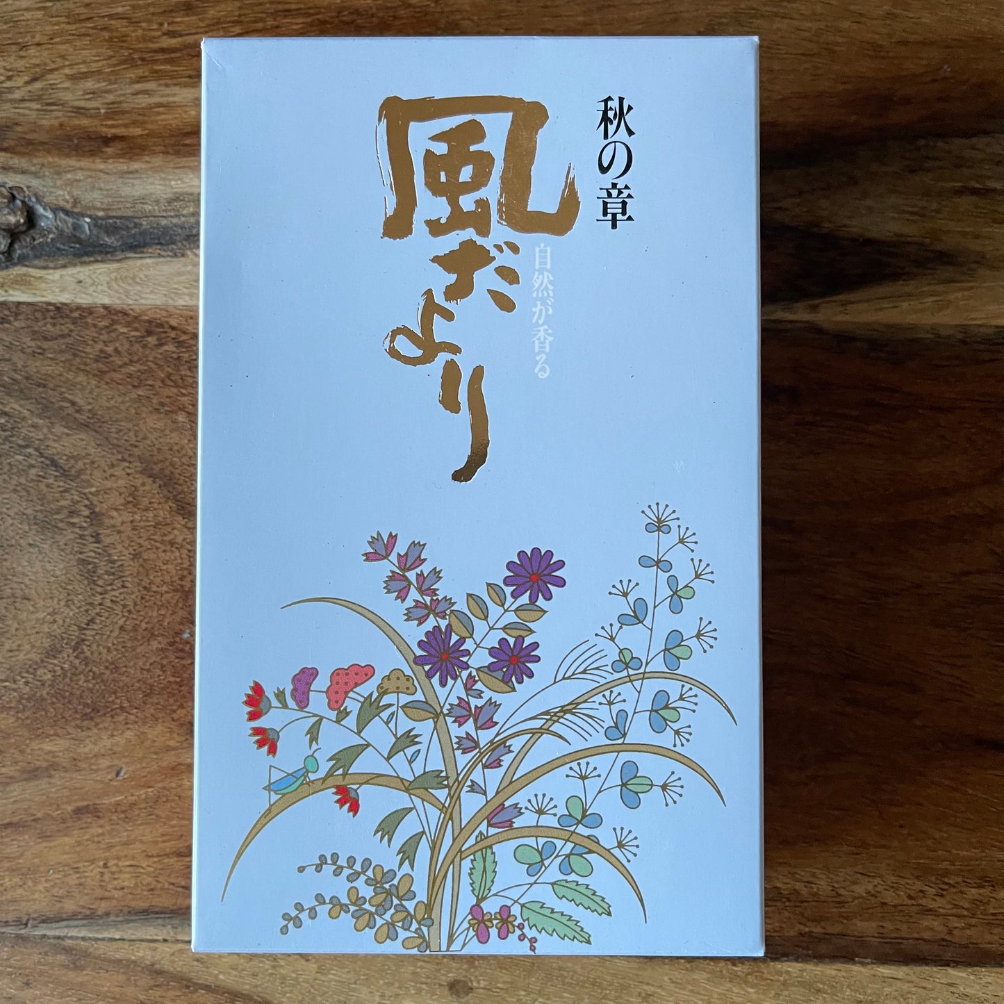 The packaging on the Kazedayori Autumn incense is adorning with gentle Japanese style floral artwork, featuring oak moss and other flowers.