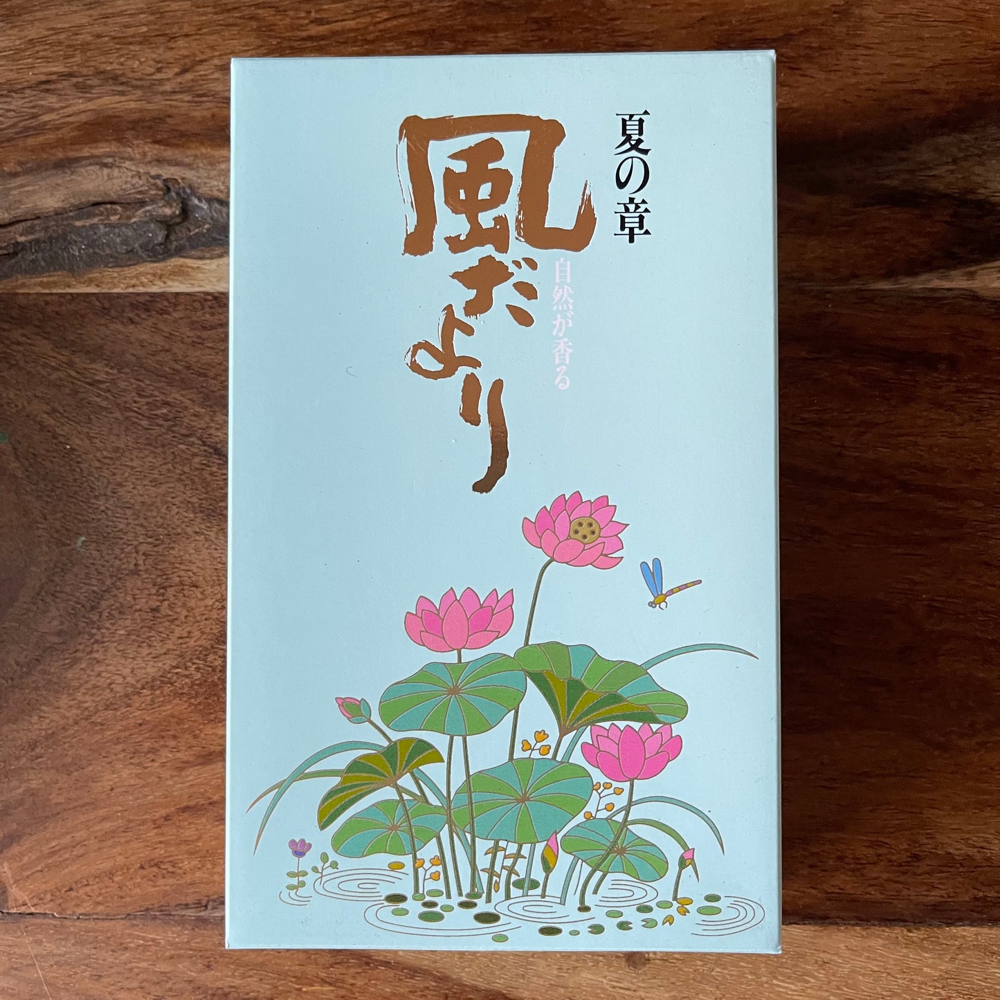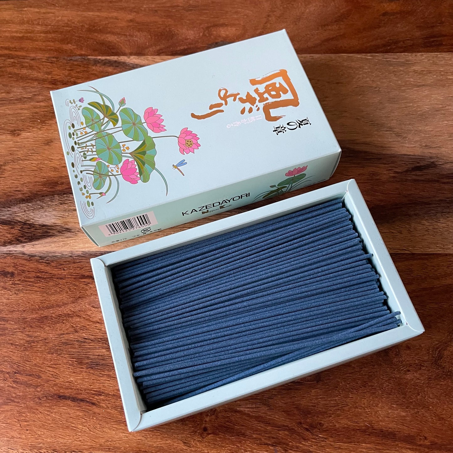 The Summer Kazedayori incense takes inspiration from the Japanese lotus flower, plus has notes of lily of the valley. The scent is refreshing, floral and feminine. According to Asian beliefs, which often depict deities sitting on lotus flowers, the lotus flower is linked with qualities such as elegance, purity, beauty and grace.
