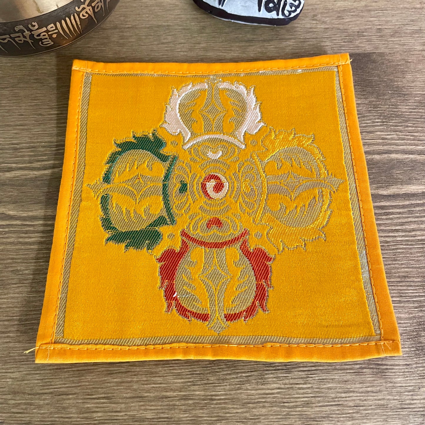 Small cloth to place under a singing bowl or on an altar, with Buddhist ornaments.