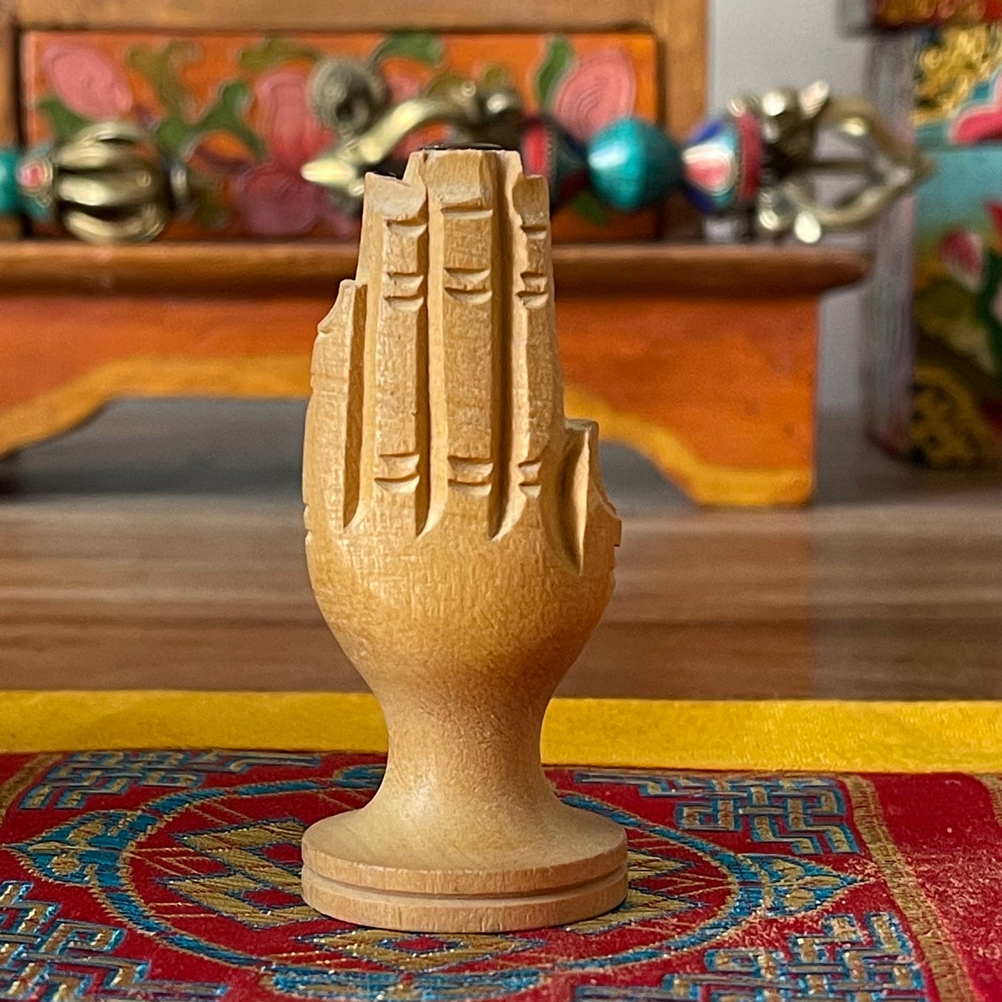 Hand carved piece of wood has been hand sculpted to look like hands joined together in prayer.