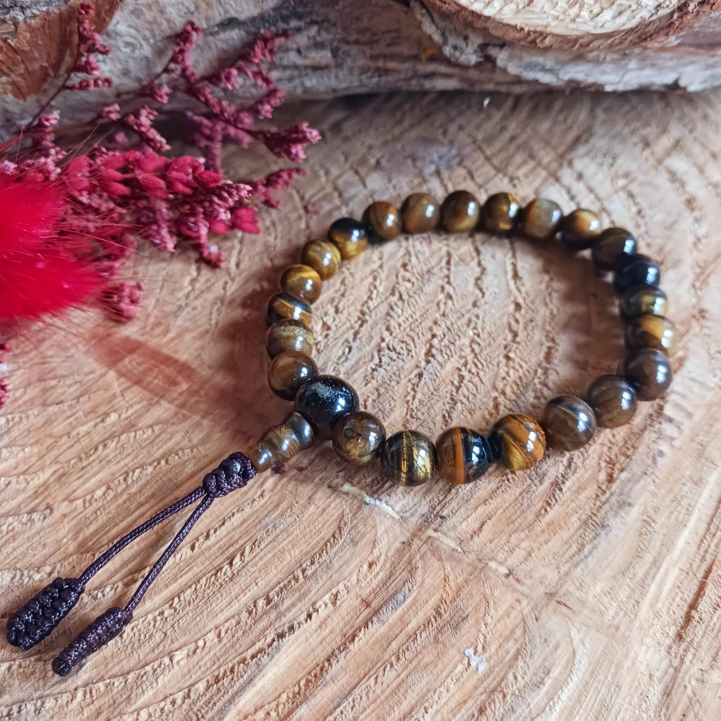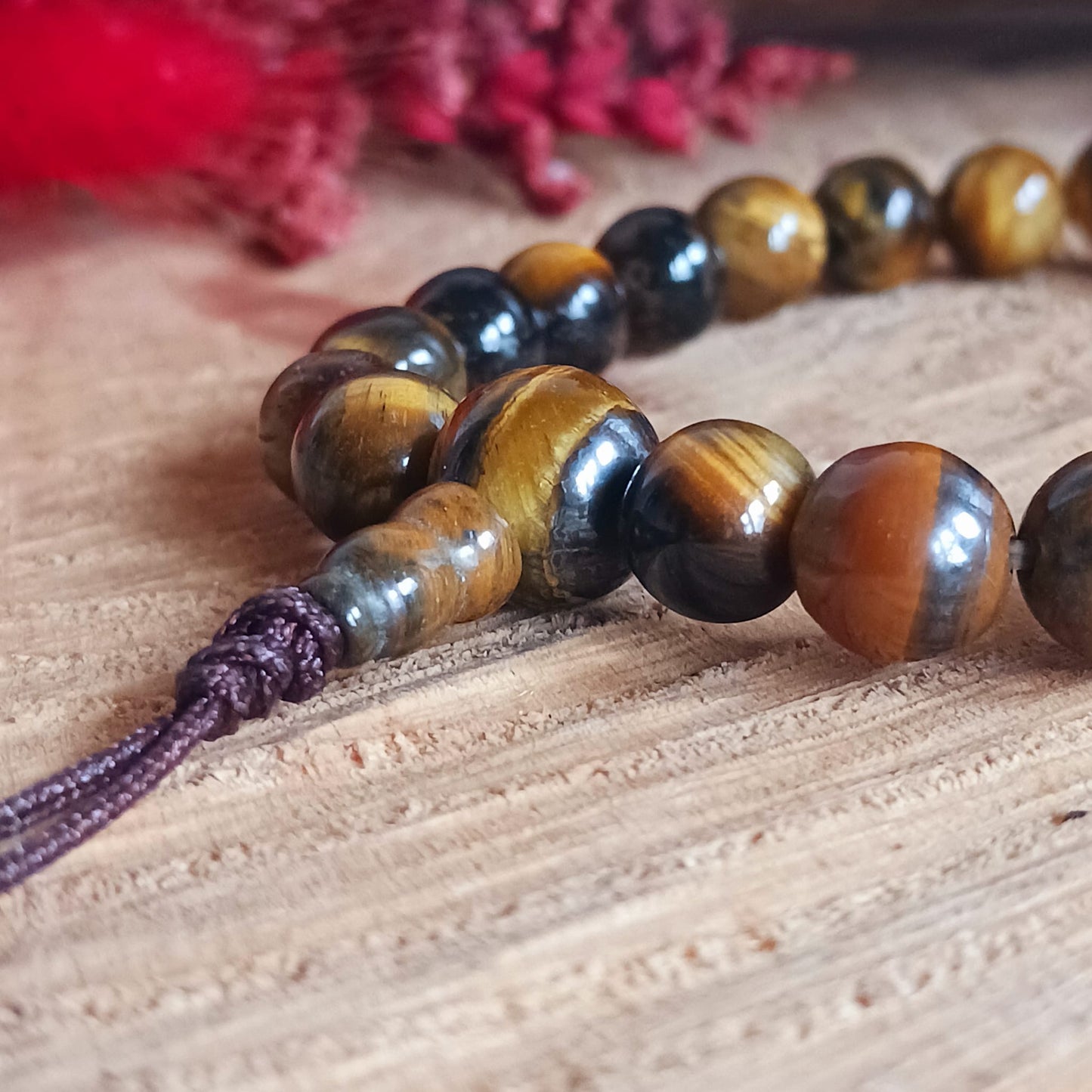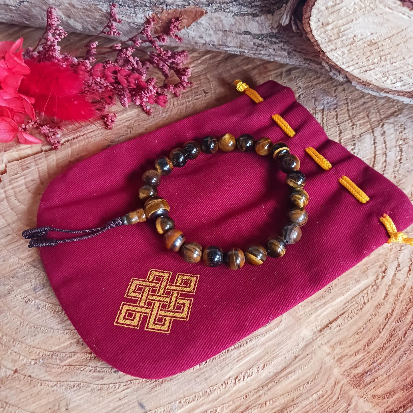 A set of Tigers eye mala beads strung on an elasticated cord, perfect for wearing on the wrist. Each mala comes in its own little recycled pouch making it an attractive gift.