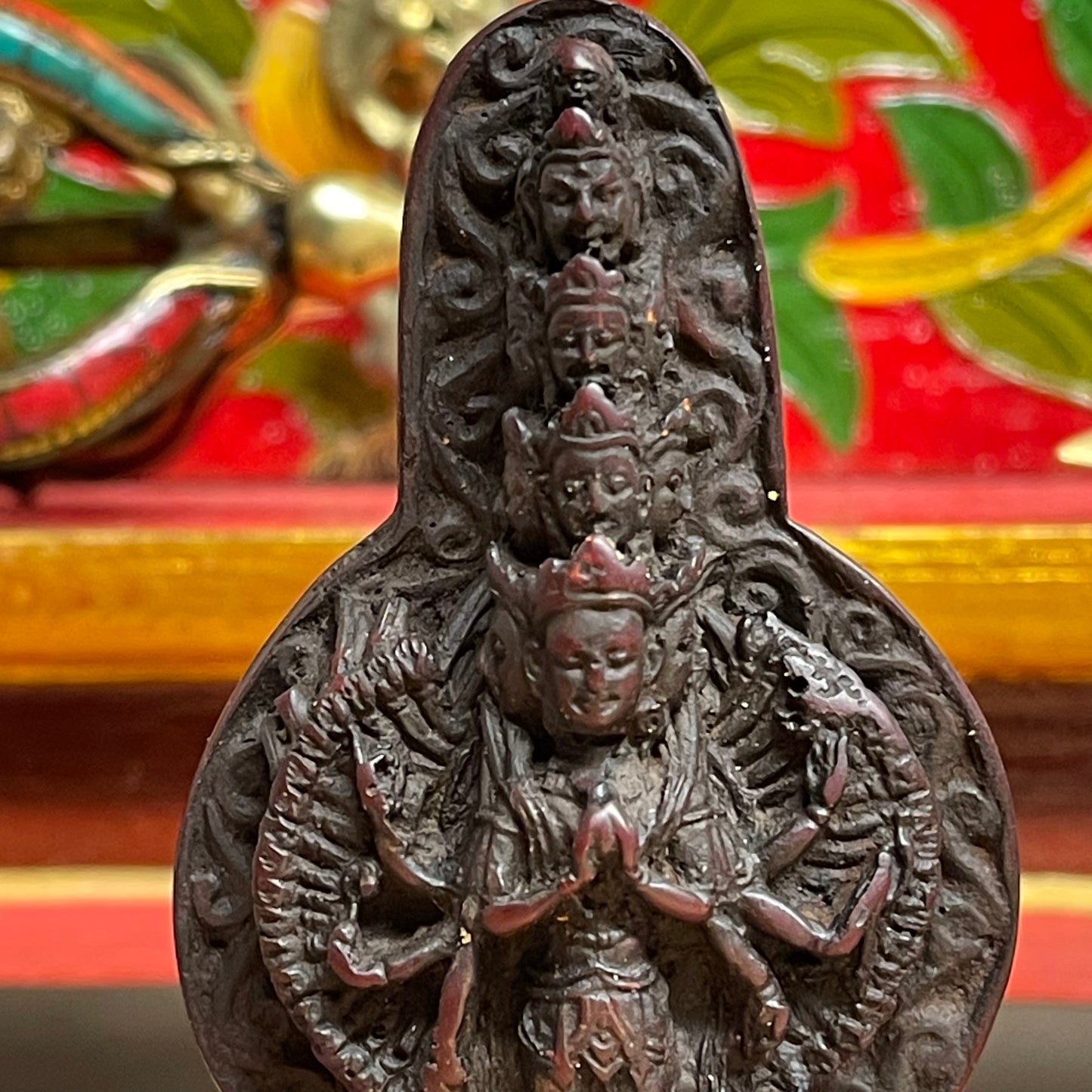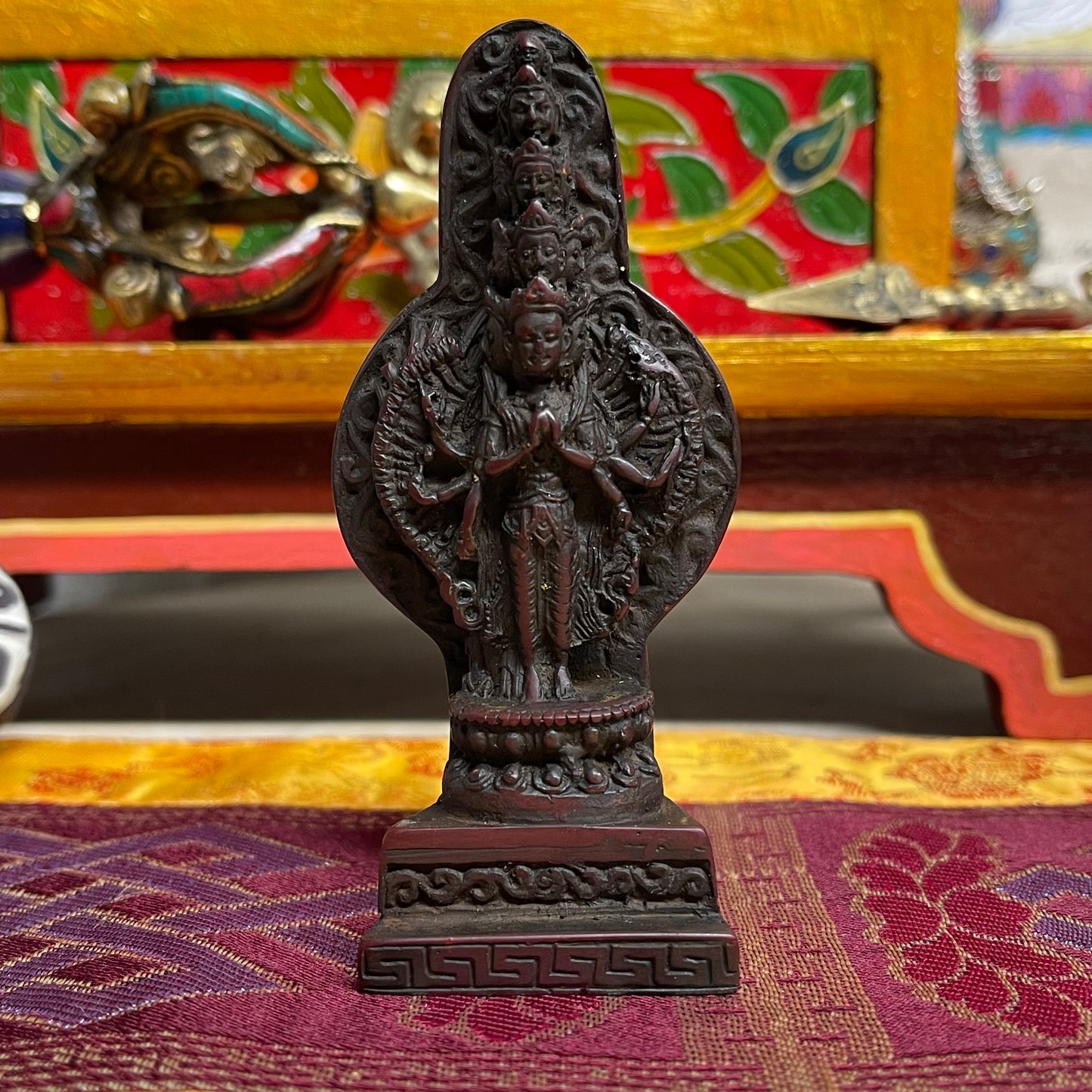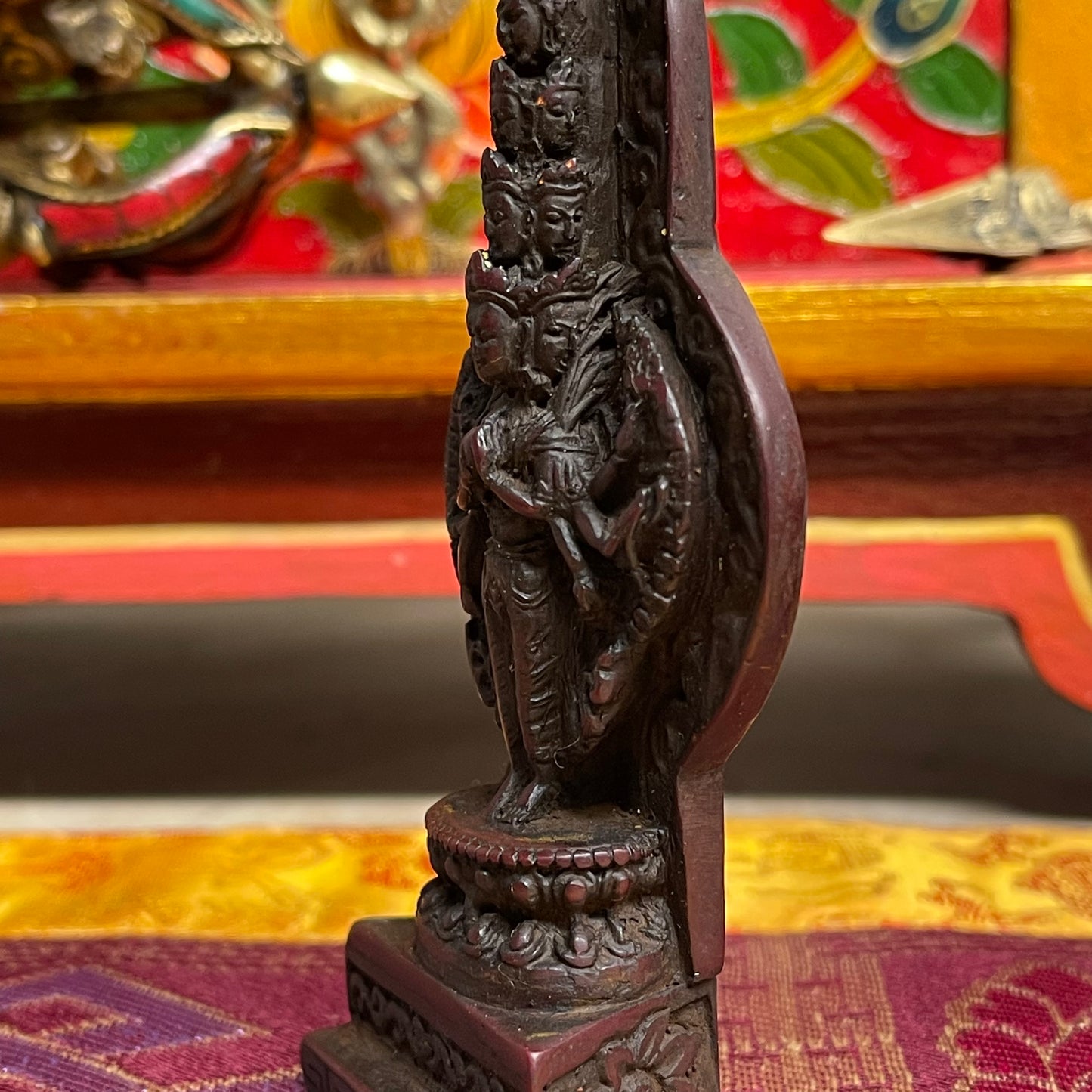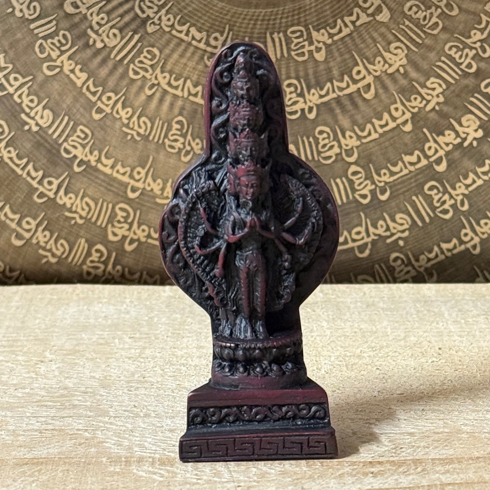 Avalokiteshwara, a popular Bodhisattva, is depicted in various forms across Buddhism. In the Sahasrabhuja form, he has multiple heads and arms. A famous story says he vowed to free all beings from samsara, but realized many still suffered. He gained eleven heads and a thousand arms to hear and aid those who suffer.