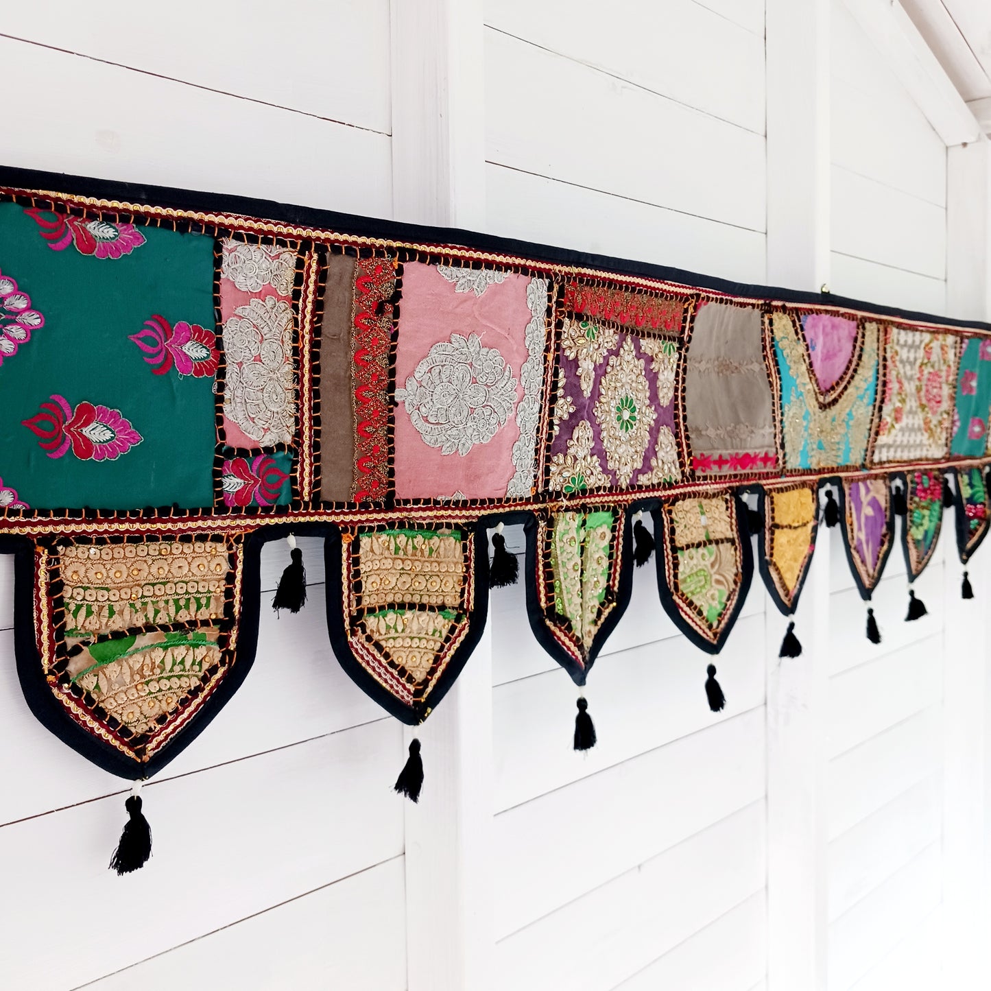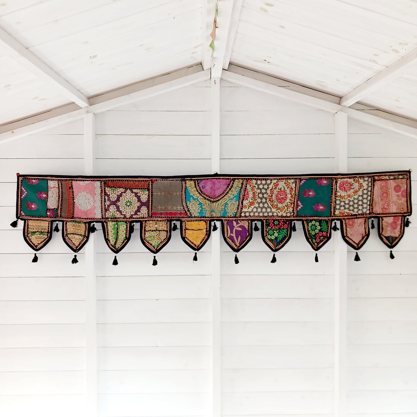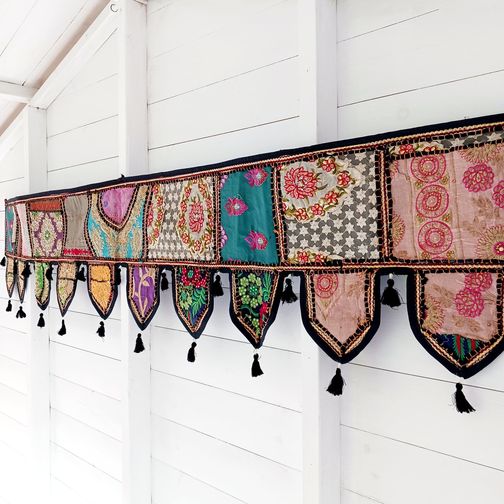 This long and beautifully intricate Indian Toran has been handmade from patches of vintage fabrics, wedding saris and recycled fabrics. It will be a unique addition to any home and bring vibrancy of colour and embellishment.