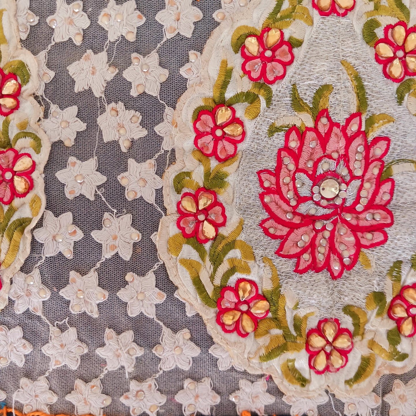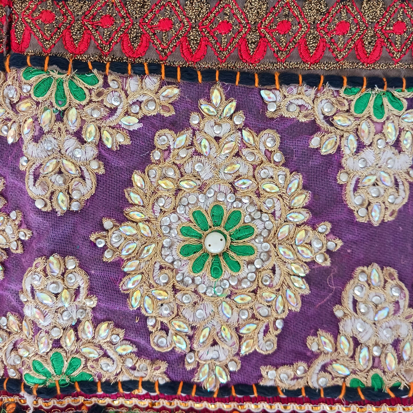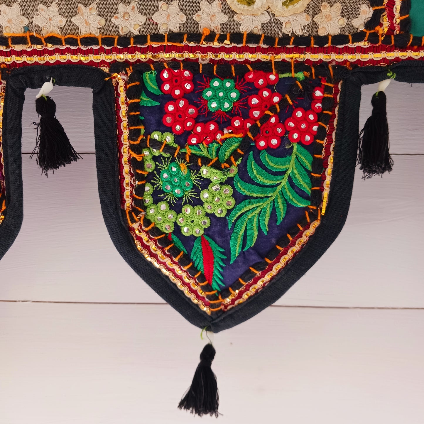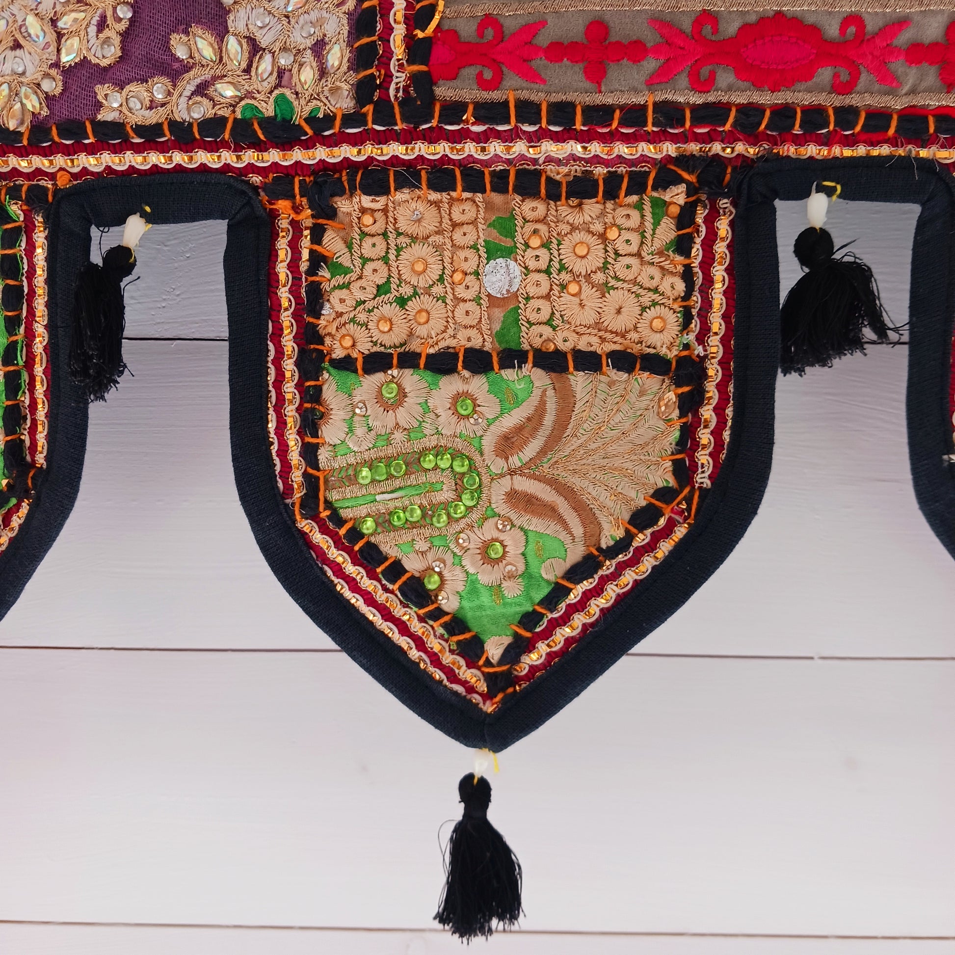This long and beautifully intricate Indian Toran has been handmade from patches of vintage fabrics, wedding saris and recycled fabrics. It will be a unique addition to any home and bring vibrancy of colour and embellishment.