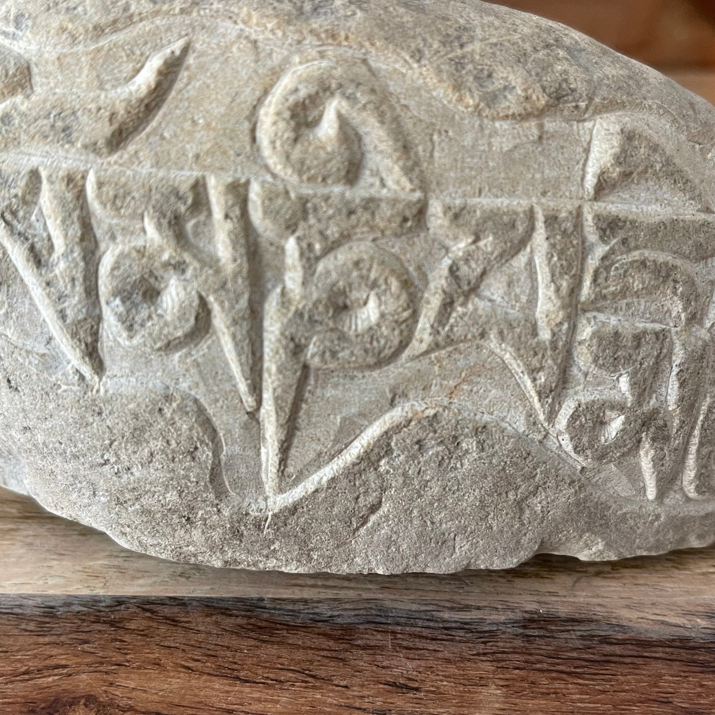 flat boulder with hand sculptured relief, picturing the mantra Om Mani Pad Me Hum.