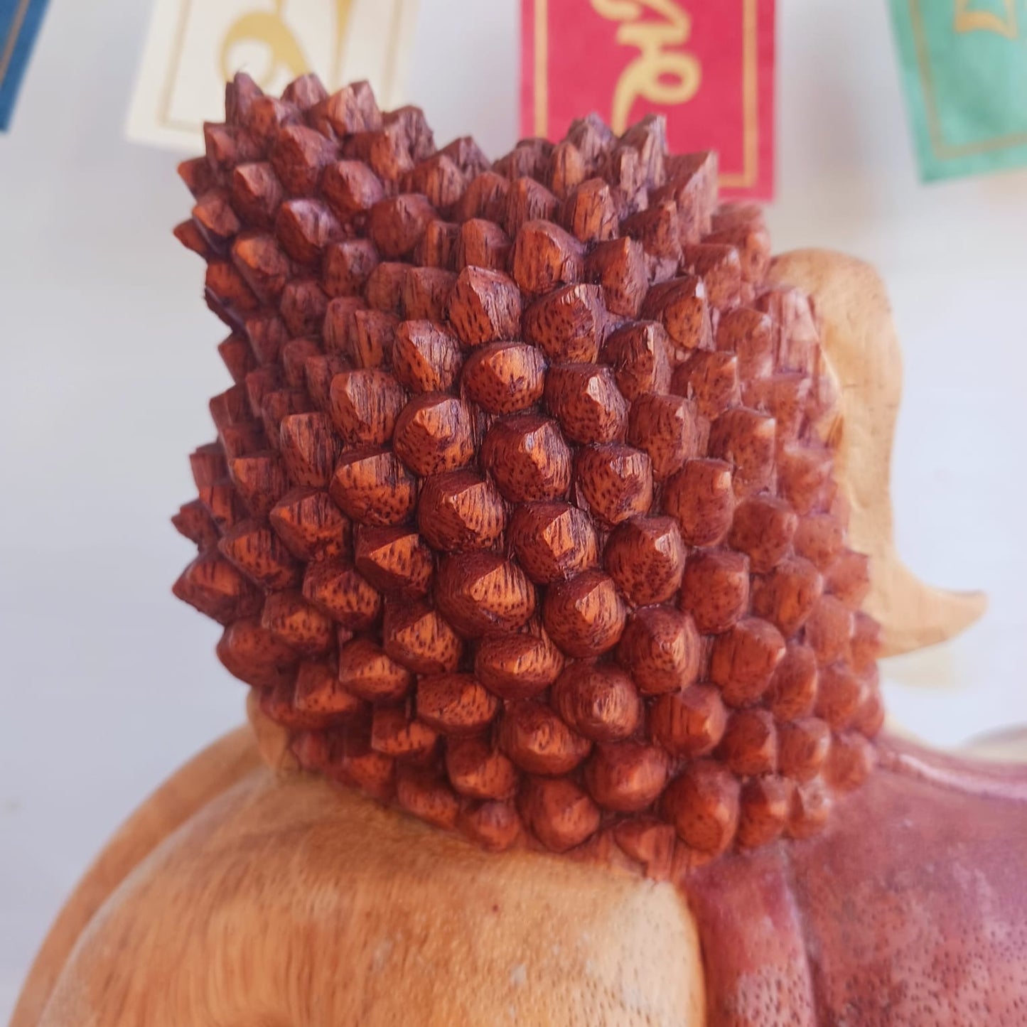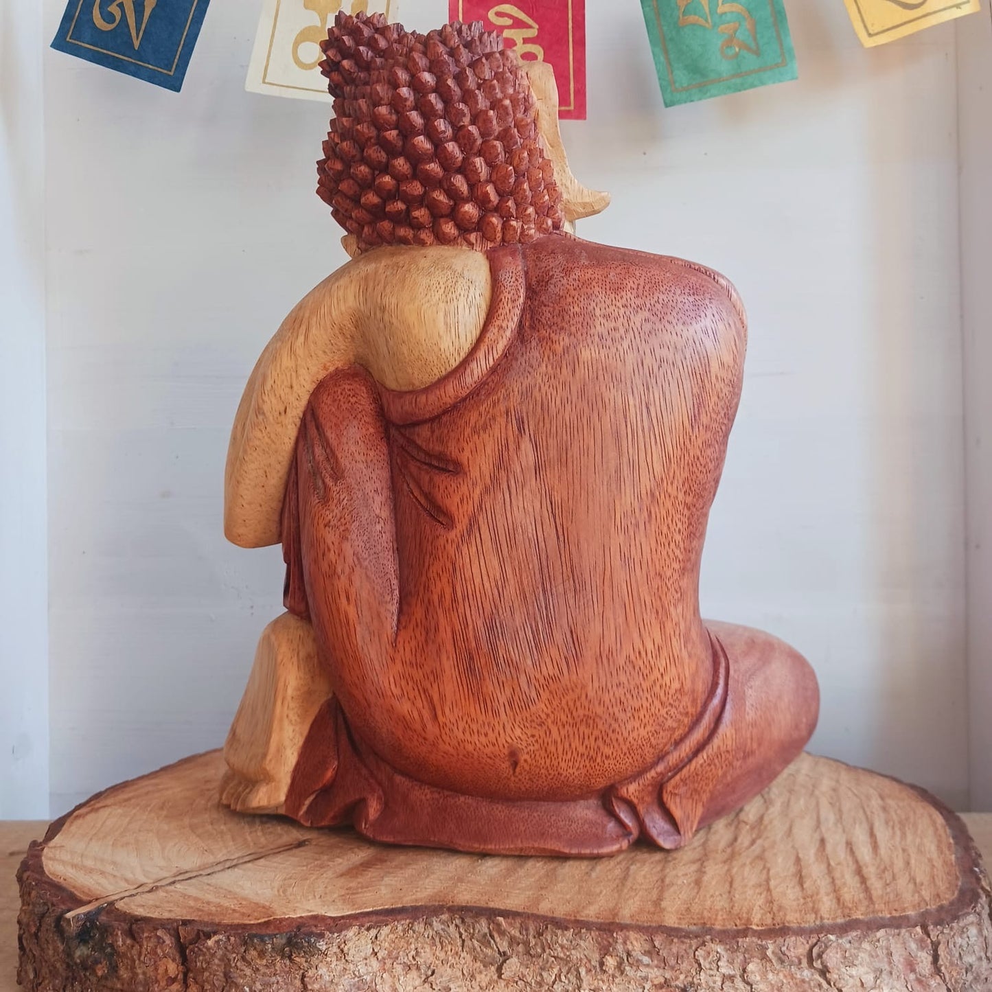 This beautifully handmade Resting Buddha statue has been carved from Suar wood which is a fast-growing species, allowing for sustainable cultivation. The Albizia Saman species of tree is widespread, abundant, and in no danger of extinction. The Buddha is carved using tools in the traditional Balinese way, bringing each detail to life in a three-dimensional work of art. Hand carved Buddha statues can take up to weeks to carve.