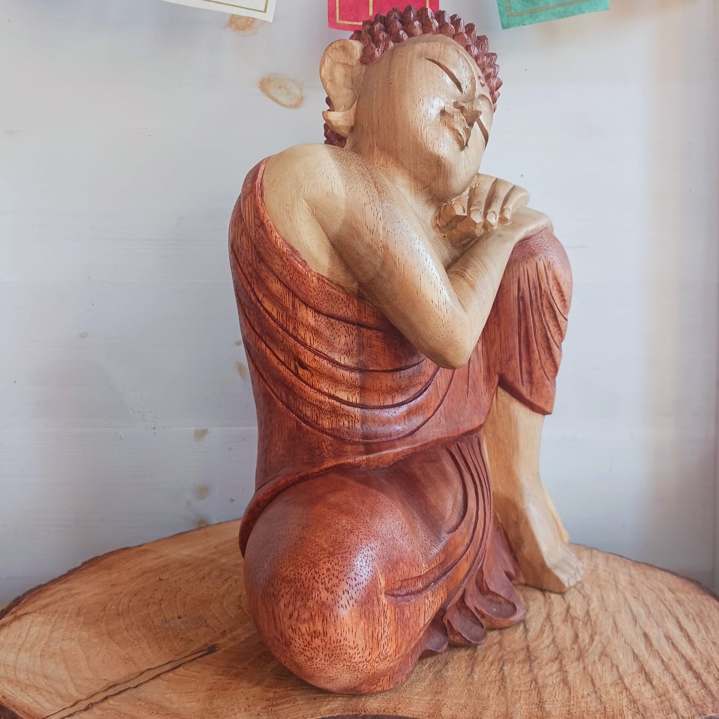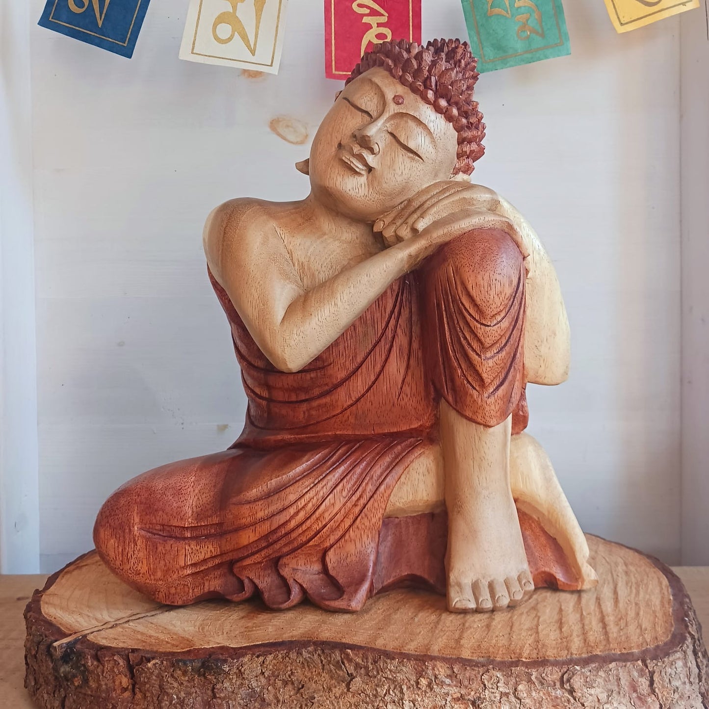 The Buddha is in the Resting Pose with hands and head resting on one knee, which is drawn up against his chin, and his eyes are closed. This pose conveys a state of total tranquility and relaxation, having reached enlightenment and being liberated from all forms of sorrow.